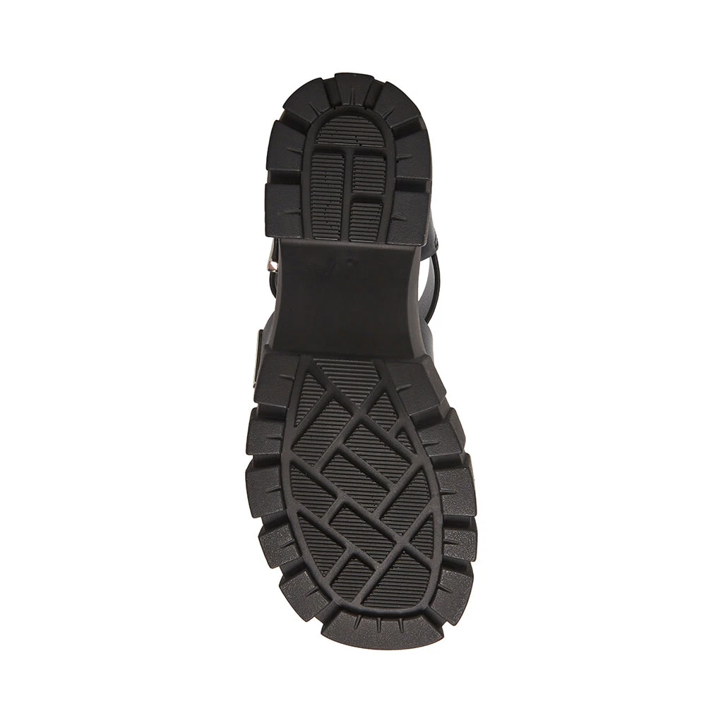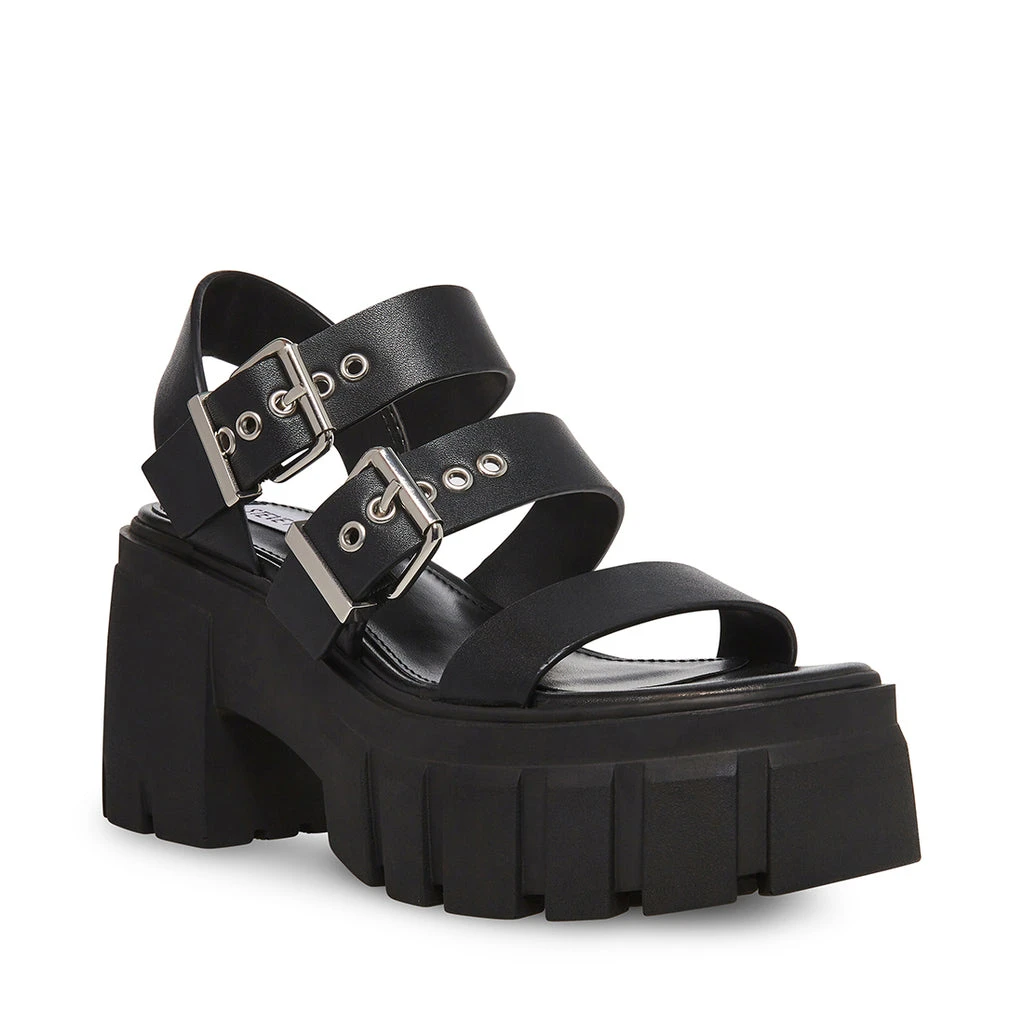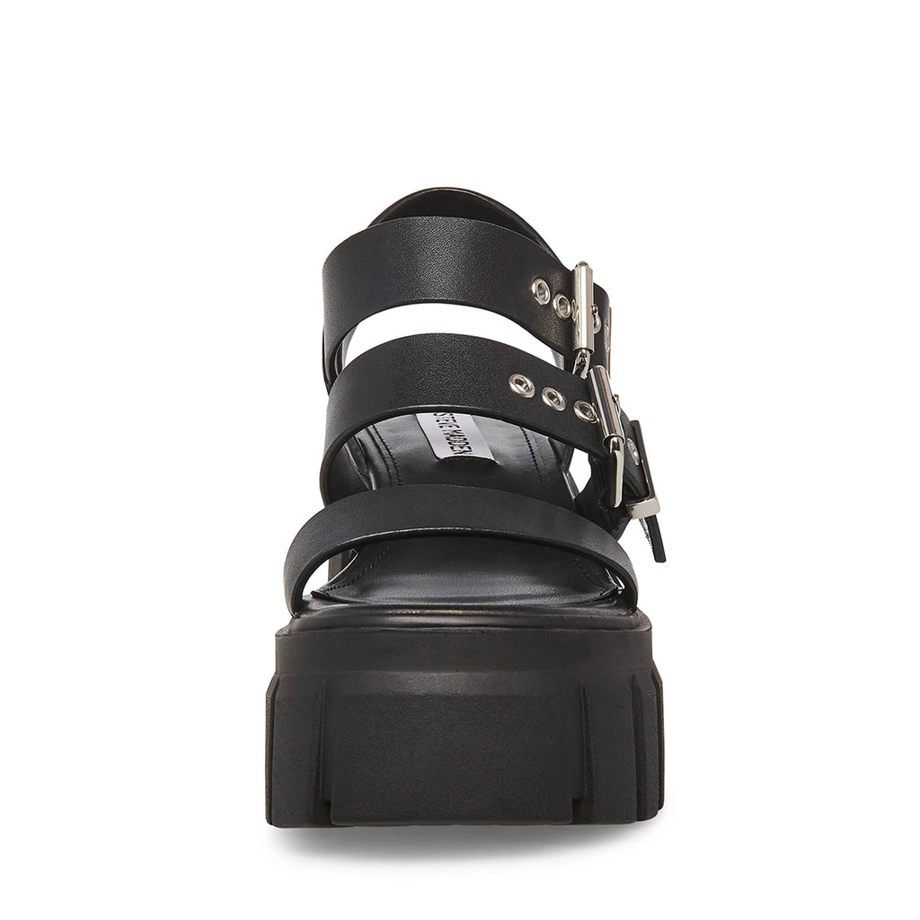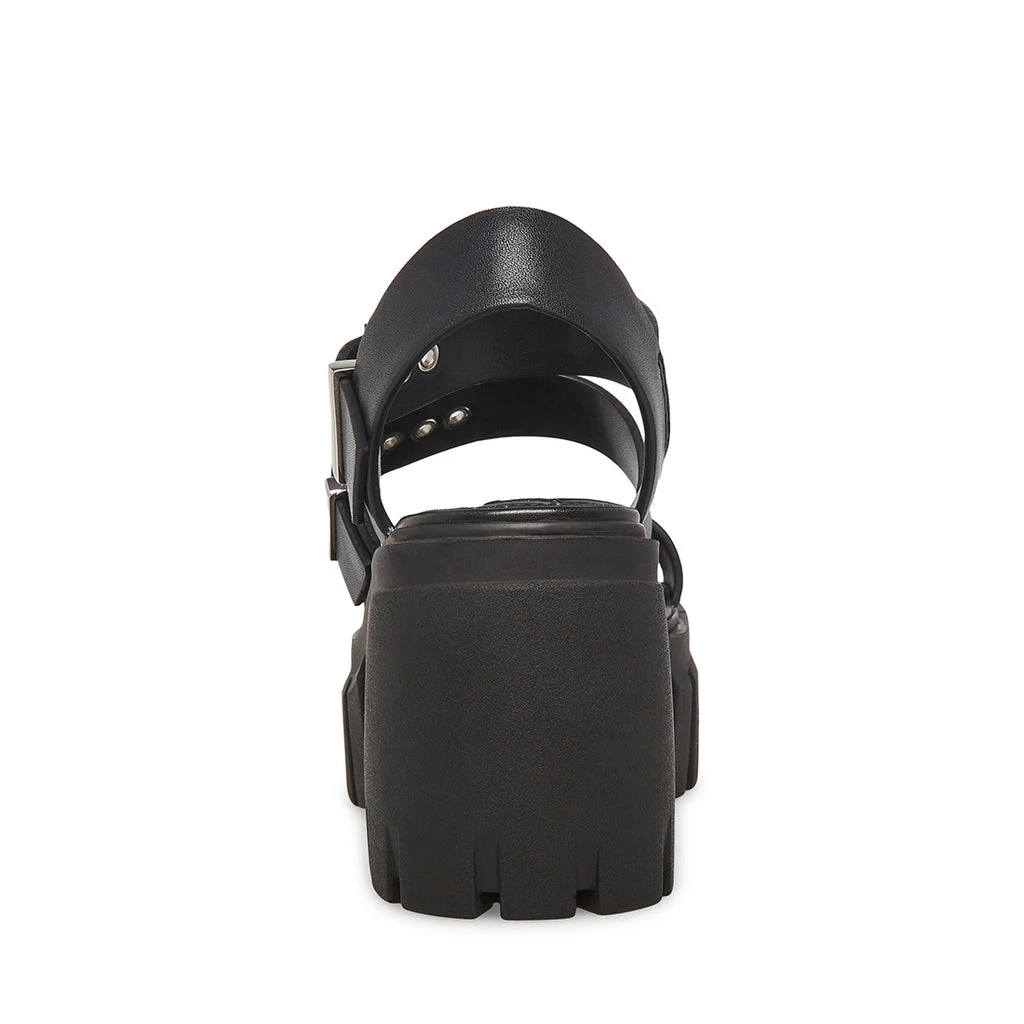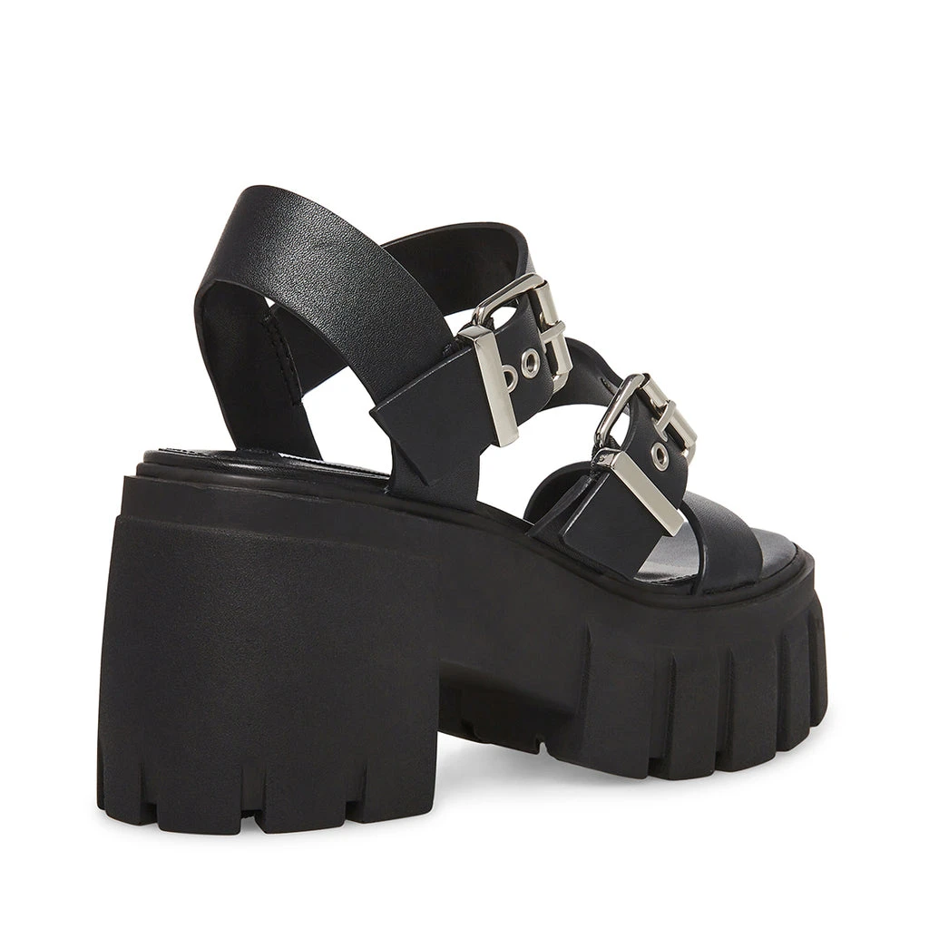 The LOCATE sandals are secured to the chunky platform heel with a wide leather strap design and substantial buckle hardware.